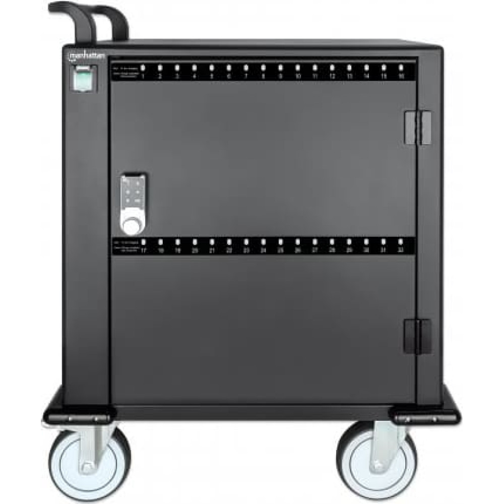 | Charging Cart - a mobile charging solution for hospitality, educational environments and more Visitors, guests and employees bring their mobile devices to all sorts of venues. Give your patrons a way to charge the drained batteries of their smartphones or tablets with the 32-Port Charging Cart - 576 W from Manhattan. It's the ideal charging solution for restaurants, schools, gyms, doctor’s offices, universities, hotels, car rental agencies and more. Fast-charging with state-of-the art device safety Mobile users want their devices back quickly. Thanks to Power Delivery 3.0 technology on all 32 USB-C ports, they won’t have to wait long. With power per port up to 3 A / 18 W, smartphones, tablets and other USB devices are ready to go in no time. The front-mounted LEDs show you when a battery is fully charged. Two additional AC outlets and one USB-A port on the back let you charge devices externally without having to open the Charging Cart. All these expensive devices are a lot of responsibility, but the safety mechanisms in this Charging Cart are just as extensive. This USB charging cart offers protection against overload, overcurrent, short circuit, voltage spikes and even lightning strikes. Physical security is key Thieves and vandals don’t stand a chance against the sturdy, durable metal housing of this Charging Cart. Lock it securely with a pin code and give access only to authorized personnel. Its heavy-duty caster wheels let you roll it to the area you need it. A built-in fan and ventilation slots dissipate heat and keep all devices cool. Organized and versatile Keep your devices organized in the 32 bays that offer plenty of space 330 (D) x 22 (W) x 235 (H) mm, even for bulky cases. Use the cable management built into the dividers to structure your charging cables (e.g. #356213 or #354868 from Manhattan). As this Charging Cart features USB-C ports instead of AC outlets, you do not need additional wall chargers. The AC input on the back is a C20 connector that lets you replace the included power cable with other cables based on your region. |