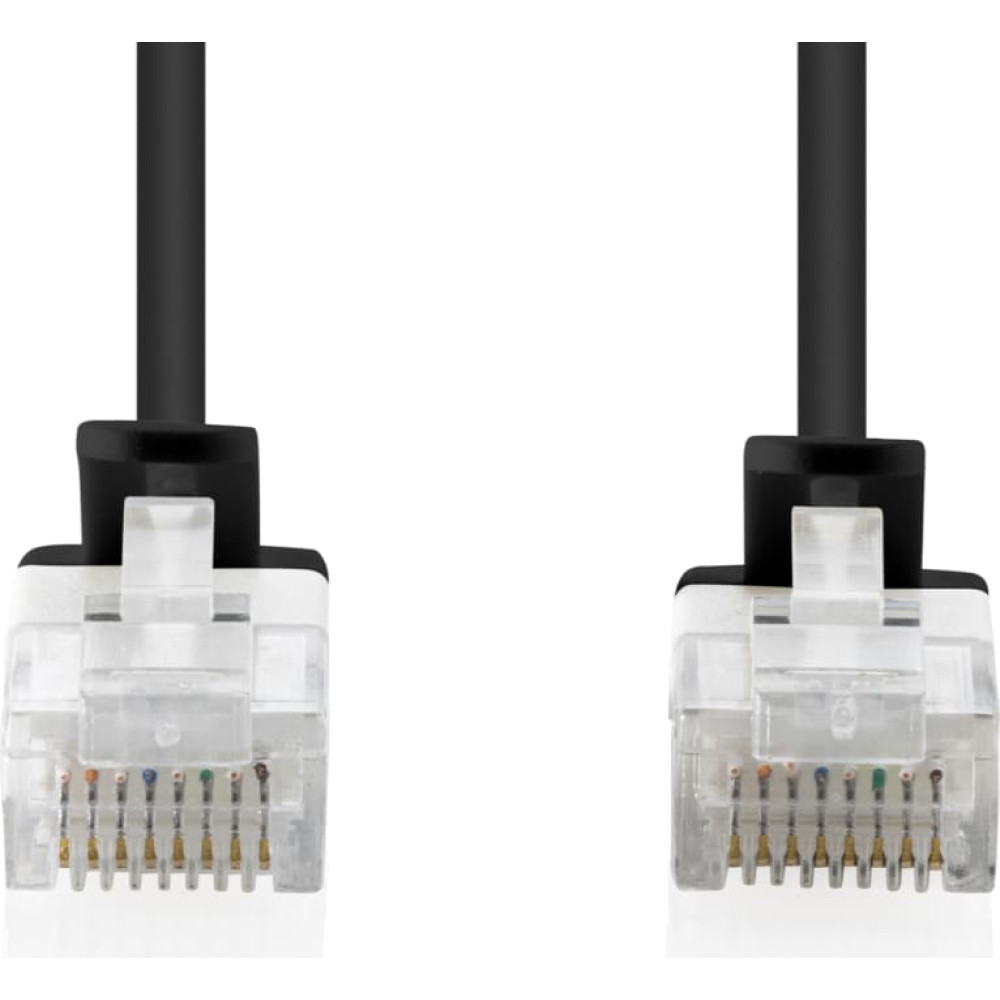| CAT 6 U-UTP slim patch cord, Cu, LSZH AWG 32/7, length 0.3m, Black Future-proof standard and reliable CAT 6 performance for your network. Advantage: Slim cable diameter of 2.7 mm with high flexibility for easy installation in confined spaces Features: Transmission speed up to 1 Gbit/s and frequency 250 MHz Application area: Ideal for office networks, home use, patch panels and environments with high cabling density PoE-capable: Supports PoE and PoE+ applications with pure copper conductors DIGITUS® CAT 6 U-UTP Slim patch cables with a transmission frequency of up to 250 MHz are equipped with a reduced outer diameter of only 2.7 mm and a flexible jacket, which enables space-saving and versatile use in any network. The cables have stranded AWG 32/7 copper conductors and an unshielded twisted pair structure (U-UTP), which ensures flexibility and durability. They are manufactured in accordance with ISO/IEC 11801 and DIN EN 50173 CAT 6 standards, ensuring reliable compliance with international specifications. Each cable is equipped with a molded anti-kink sleeve with strain relief and a locking lever protection that prevents cable damage and locking breaks. These slim patch cables are supplied in DIGITUS® hangtag packaging and are the ideal solution for structured cabling in offices, homes or high-density environments. Configuration: 1:1 Category: CAT 6 Shielding: U-UTP, unshielded Length: 0.3 m Color: black Jacket: LSOH Slim Version: true Flat Version: false Outer casing: LSZH (Low Smoke Zero Halogen) Total diameter: 2.7 mm ± 0.15 mm Stranded wire: AWG 32/7 bare copper, 0.08 ± 0.005 mm Insulation: HD-PE (high-density polyethylene) Bending radius: 15x outer diameter Plug: RJ45 plug Color code: Orange x white, green x white, blue x white, brown x white Cabling standard: EIA/TIA 568B PIN assignment: 1:1 Contact resistance: maximum 376.96 ?/km at 20 °C Imbalance of the resistance: maximum 3 % Operating temperature: -20 °C to +60 °C Flame retardancy: IEC 60332-1 Smoke emission: IEC 61034 Typical applications: IEEE 802.3: 10BASE-T; 100BASE-T; 1000BASE-T Standards: ISO/IEC 11801-1; EN-50173; ANSI/TIA 568-C; EN 60603-7-4 Dielectric strength: 500 V alternating current for 1 minute without breakdown (TIA/EIA-364-21) Service life: 750 mating cycles Packaging: DIGITUS hangtag |