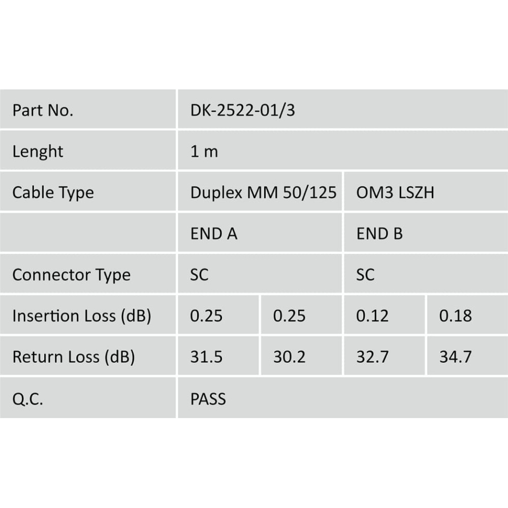 FO patch cord, duplex, SC to SC MM OM3 50/125 µ, 1 m Future-oriented standards and high-end quality for your network. FO patch cord, duplex, SC to SC,MM OM3 50/125 µ, 1 m Assortment: Fiber Optic Patch Cables Boot: two-color Cable diameter: 2 mm Cable type: I-VH 2G50/125µ Color cable: aqua Connector 1: SC Connector 2: SC Fiber class: OM3 Fiber diameter: 50/125µ Mode: Multimode Packaging: DIGITUS Polybag Length: 1 m Duplex cable LSOH Connector with ceramic ferrule Cable diameter 2 mm Single packed with test-report |