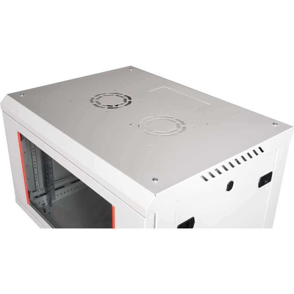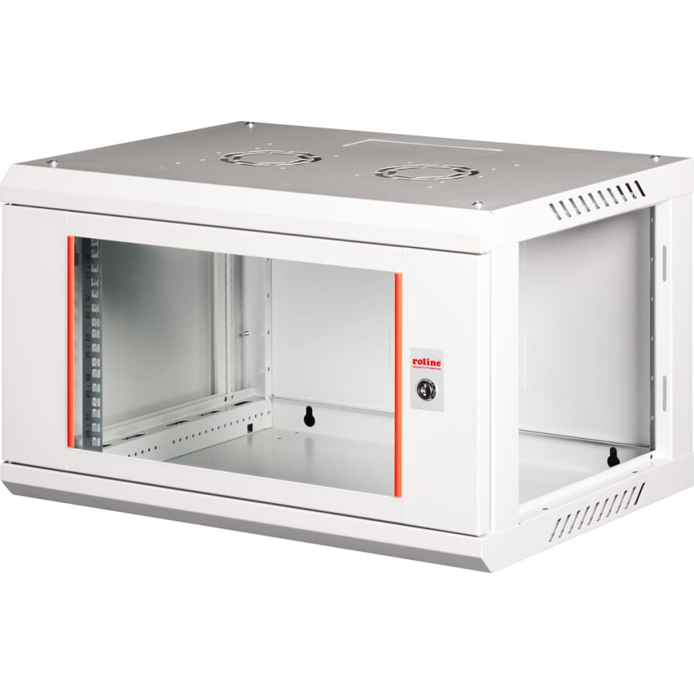 ROLINE 19 inch wall-mounted housing Basic Plus with 450 mm depthThe wall-mounted enclosures in the ROLINE Basic Plus series have been specially designed for flexible network cabling. This series represents an ideal balance between the ROLINE PRO and ROLINE Basic series. The base plate and the roof are equipped with a punched cable inlet. In addition, a punched-out area in the roof makes it possible to accommodate a fan module. Inside, a pair of galvanised profile rails with height units of 483 mm (19") are installed, which are also adjustable in depth. The robust steel constructions of the cabinets are made of strong sheet steel and are available powder-coated in grey (RAL 7035) or black (RAL 9005). The side panels are fitted with a quick-release fastener and are removable, which improves accessibility. An optional lock can also be installed in the side panels. Wall mounting is carried out in two simple steps: Firstly, the rear panel is screwed to the wall and then connected to the housing. Optional levelling feet or castors can be used to make the cabinets free-standing.