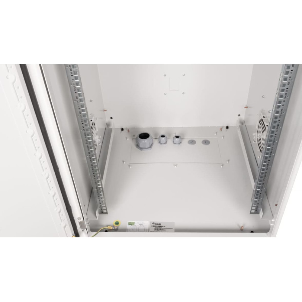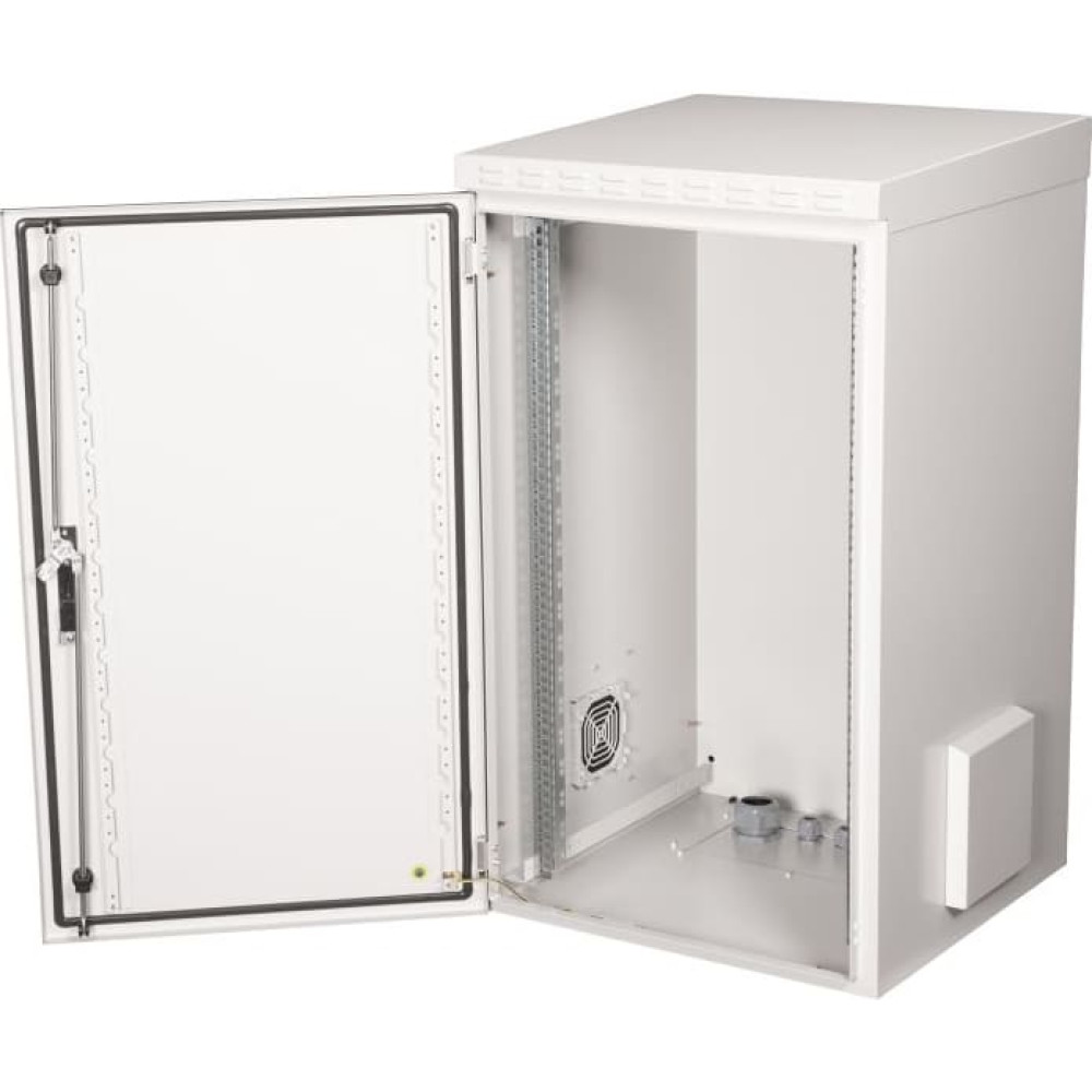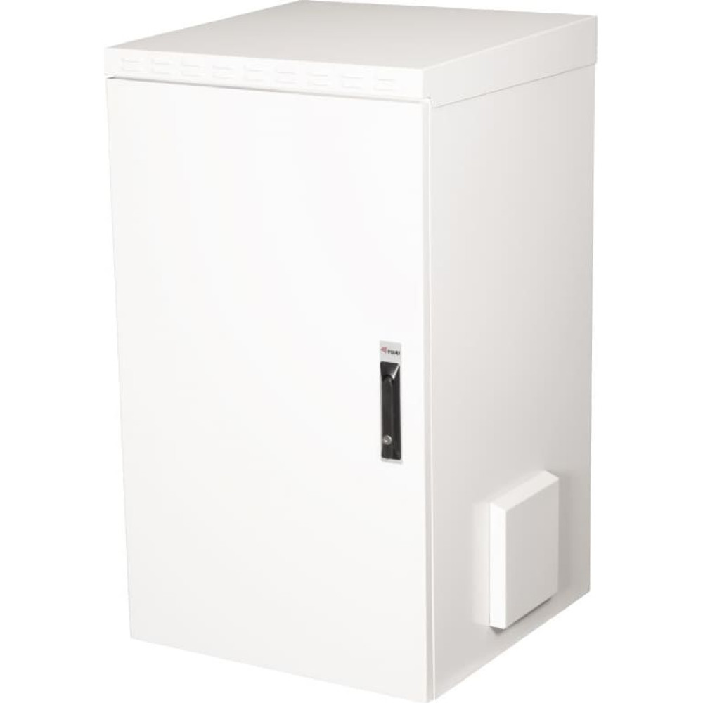 The "Safe Outdoor" Cabinet Line presents the 483 mm (19") IP55 Outdoor Wall Mount Cabinets, tailored for industrial use. Adhering to the IP55 safety standard as per EN 60529, they offer resistance against both water and dirt infiltration. Enhanced security is ensured with a 3-point-locking system complemented by a lockable swing handle and insulated cable entry points. The cabinets also feature integrated air ventilation slots for fresh air circulation, maintaining protection against water and dust as per IP54 standards. These cabinets are ideal for locations exposed to environmental elements like rain, dust, sleet, snow, and splashing water. For more flexibility, these cabinets can be paired with a plinth for standalone setups. When using the plinth, rear mounting holes can be sealed using plugs sourced from the cabinet's base. |