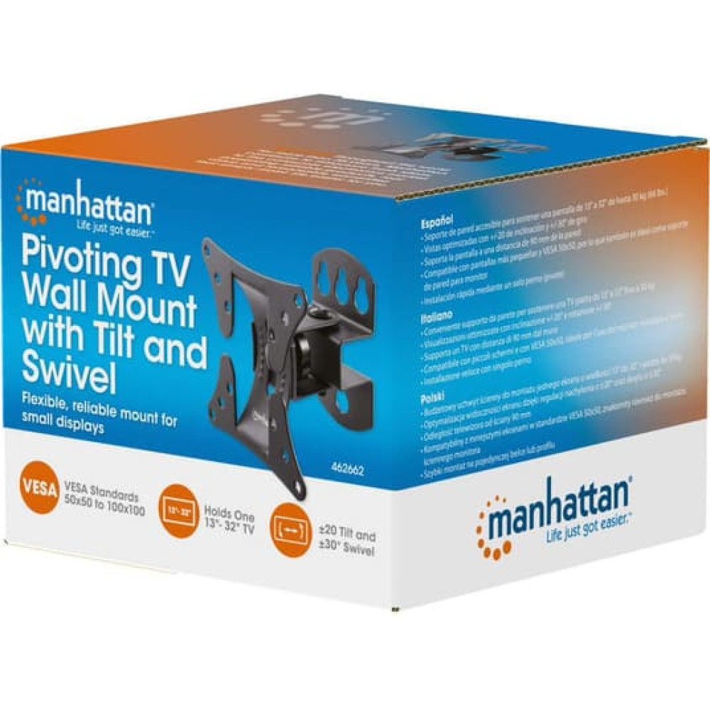 Manhattan 462662. Maksimālais svars (tilpums): 30 kg, Minimālais iespējamais ekrāna izmērs: 33 cm (13"), Maksimālais iespējamais ekrāna izmērs: 81,3 cm (32"), Montāžas saskarnes saderība (min): 50 x 50 mm, Montāžas saskarnes saderība (max): 100 x 100 mm. Slīpuma leņķis: -20 - 20°, Šarnīrsavienojums: -30 - 30°, Attālums līdz sienai (min): 9 cm, Attālums līdz sienai (max): 9 cm. Produkta krāsa: Melns |