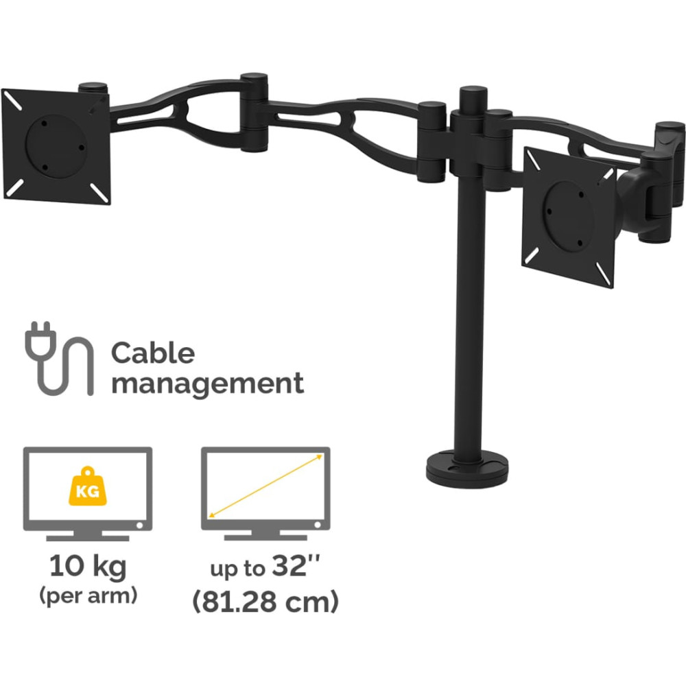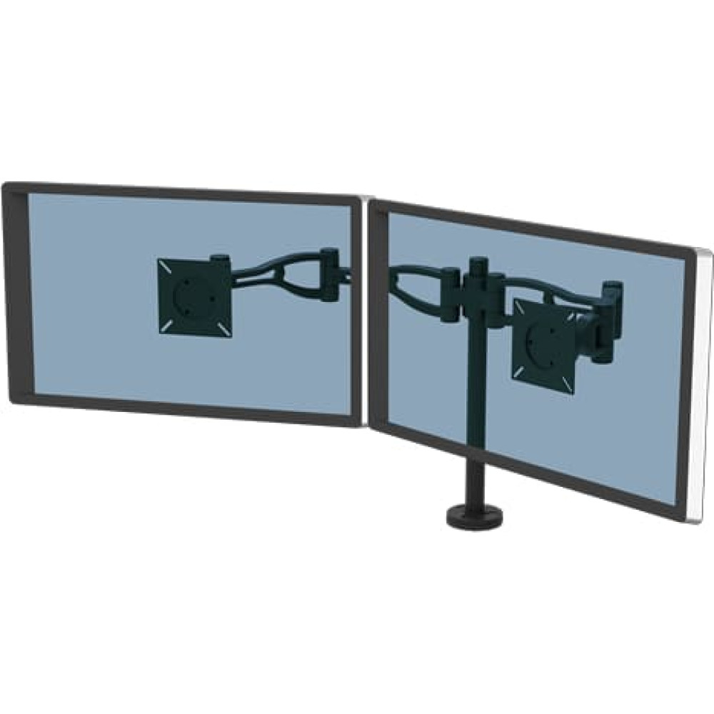 | Sitting or standing with bad posture all day using a computer is bad for your health. Leaning forwards or tilting your head up or down not only causes back and neck strain but is also bad for your eyes. The Fellowes Vista Dual Monitor arm will improve your ergonomic posture and reduce back neck and eye strain. Working with a dual monitor stand means you can view more screen content and can use multiple programs simultaneously. With ever shrinking office spaces, using a dual monitor mount means you can free up valuable work space to become more organised and productive. With effortless adjustment you can collaborate and share information with colleagues easily, making them ideal for hot desks or shared desks. The Fellowes double monitor stand is ideal for any workspace, with its stylish, continent design. This fully independent adjustable dual monitor arm by Fellowes can pan 180° and can rotate 360° for optimum viewing control. Minimise clutter with the Vista Series monitor stands which feature an intuitive cable management system to keep your workspace tidier. Easily mounted via clamp, each of the monitor arms can hold up to a 10KG monitors with a maximum screen size of 26" / 66.04cm and meets VESA monitor desk mount standards. |