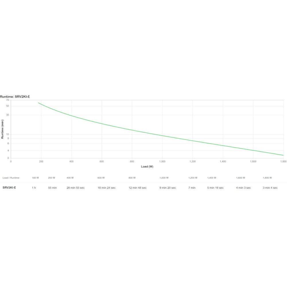 APC SRV2KI-E. UPS topoloģija: Divkāršā-konversija (tiešsaiste), Izejas jaudas kapacitāte (VA): 2 kilovoltampērs, Izejas jauda: 1800 W. Maiņstrāvas izeju tipi: C13 uzmava, Jaudas spraudnis: C19 uzmava. Baterijas tehnoloģija: Noslēgts svina skābju (VRLA), Baterijas spriegums: 48 V, Baterijas uzlādes laiks: 4 h. Produkta krāsa: Melns, Kabeļa garums: 1,5 m, Ekrāna veids: LCD. Platums: 145 mm, Dziļums: 400 mm, Augstums: 238 mm