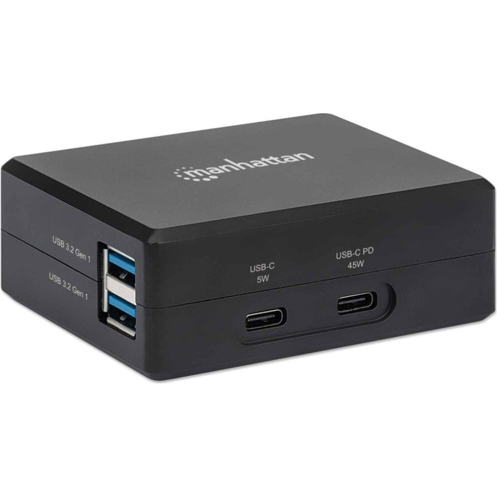 | The Manhattan Smart Video Power Delivery Charging Hub — a workstation dock for your phone or notebook that doesn't need an external power supply The compact Manhattan Smart Video Power Delivery Charging Hub offers three vital functions that smartphone power users and business travelers do not want to miss: display connectivity, peripheral hookups and power for your devices. Take it to the big screen Connect your HDMI display to your notebook or to any Android 9 and later smartphone that supports video output over USB-C and enjoy your apps and media even more. Watch a video on your TV or flip through the slides of your presentation – all from your phone. Add connectivity options Be more versatile and productive on the road with two SuperSpeed (USB 3.2 Gen 1, formerly USB 3.0) USB-A ports. Type emails on your phone or notebook with a full-size USB keyboard or drag and drop files from a USB drive to your device with a USB mouse. Power up With a 45 W USB-C Power Delivery Port, another USB-C charging port with 5 W (5 V / 1 A) and two USB-A ports with 5 V / 1 A each, you have plenty of power to charge both your notebook and smartphone while still using all workstation functions. This Manhattan PD Charging Hub also smartly protects itself and your devices from short-circuits, over-voltage, over-current and overheating. Integrated power supply for traveling light To power your notebook through a regular docking station, you always need a separate power supply for that dock, which adds weight and takes up space in your bag. The extra-compact Manhattan Charging Hub comes with an integrated power supply and detachable C7 power cable. When you need to be on the move, you can stow the separate pieces in the tighter spaces of your luggage for more space to bring along other important travel items, including other regional C7 power cables (such as C7 to US, EU, UK or another region). |