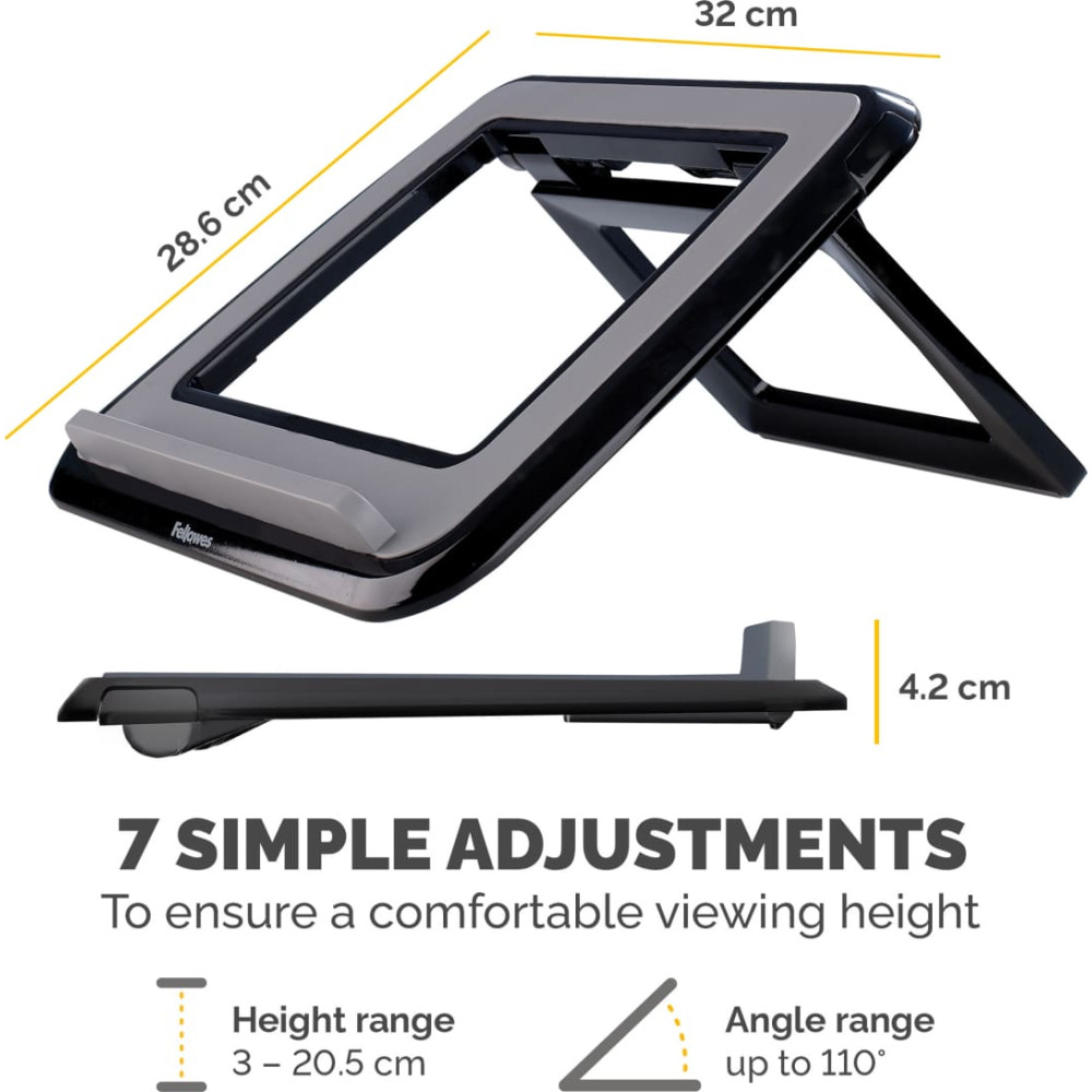 Fellowes 8212001. Produkta veids: Portatīvā datora statne, Produkta krāsa: Melns, Pelēks, Materiāls: Akrilonitrilbutadiēnstirēnterpolimēra (ABS). Augstuma regulēšanas diapazons: 30 - 205 mm, Maksimālais augstums: 20,5 cm. Platums: 320 mm, Dziļums: 286 mm, Augstums: 420 mm. Iepakojuma platums: 33 mm, Iepakojuma dziļums: 46 mm, Iepakojuma augstums: 29 mm
