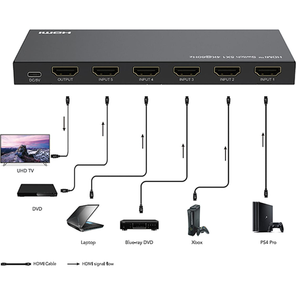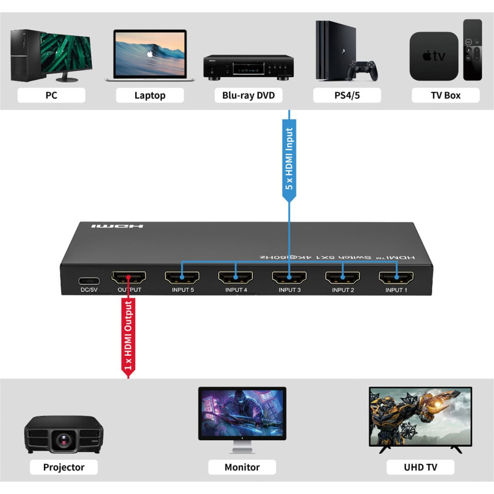 • Shows the video output of 5 HDMI devices like e.g. notebook, laptop, pc, video camera or game console on one monitor.