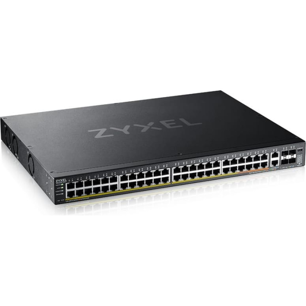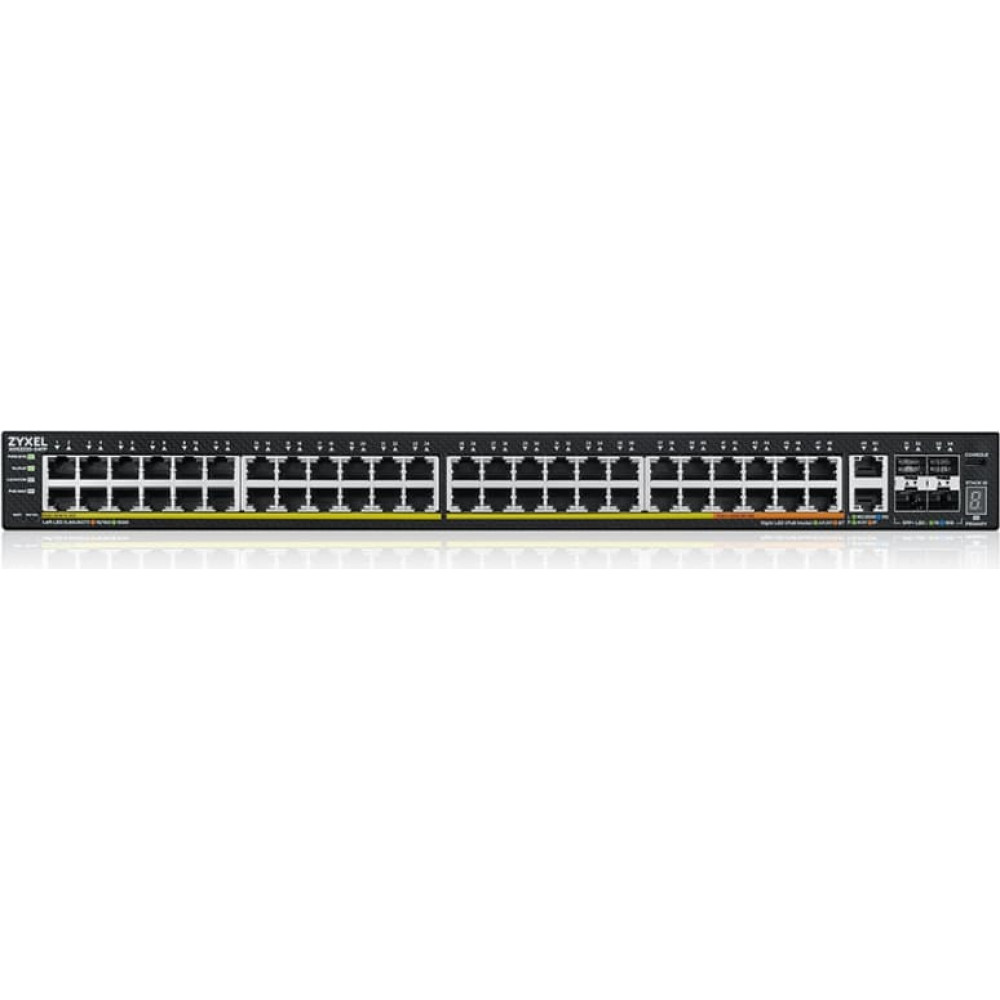 Zyxel XGS2220-54FP. Switch type: Managed, Switch layer: L3. Basic switching RJ-45 Ethernet ports type: Gigabit Ethernet (10/100/1000), Basic switching RJ-45 Ethernet ports quantity: 48, Installed SFP+ modules quantity: 4. MAC address table: 32000 entries, Switching capacity: 216 Gbit/s. Networking standards: IEEE 802.3ab, IEEE 802.3bt, IEEE 802.1ab, IEEE 802.3ad, IEEE 802.3ae, IEEE 802.3af, IEEE 802.3an,.... Power over Ethernet (PoE). Rack mounting Nebula Cloud-managed Layer 3 Enterprise Switch The XGS2220 Series is a family of Layer 3 access Switches that consists of six models, including PoE, Non PoE and Fiber options. Non PoE models offer Gigabit desktop ports for everyday network access; PoE models allow flexible options with larger PoE budgets and a mix of 60 W and 30 W ports to power devices like the latest WiFi 6/6E Wireless Access Points; The Fiber model aims to achieve business connectivity for high fiber port density requirement.
