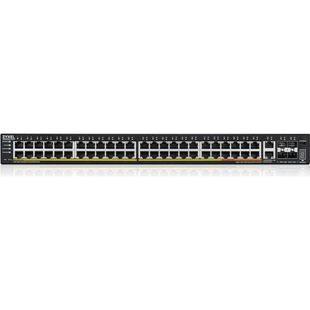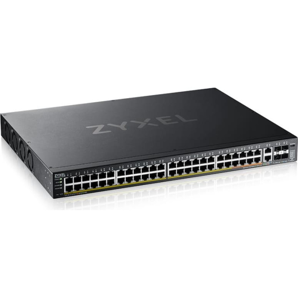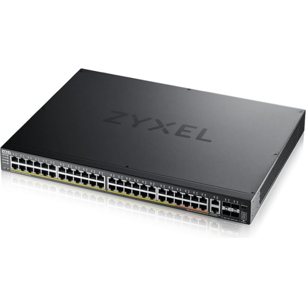Zyxel XGS2220-54HP. Switch type: Managed, Switch layer: L3. Basic switching RJ-45 Ethernet ports type: Gigabit Ethernet (10/100/1000), Basic switching RJ-45 Ethernet ports quantity: 48, Installed SFP+ modules quantity: 4. MAC address table: 32000 entries, Switching capacity: 216 Gbit/s. Networking standards: IEEE 802.3ab, IEEE 802.3bt, IEEE 802.1ab, IEEE 802.3ad, IEEE 802.3ae, IEEE 802.3af, IEEE 802.3an,.... Power over Ethernet (PoE). Rack mounting Nebula Cloud-managed Layer 3 Enterprise SwitchThe XGS2220 Series is a family of Layer 3 access Switches that consists of six models, including PoE, Non PoE and Fiber options. Non PoE models offer Gigabit desktop ports for everyday network access; PoE models allow flexible options with larger PoE budgets and a mix of 60 W and 30 W ports to power devices like the latest WiFi 6/6E Wireless Access Points; The Fiber model aims to achieve business connectivity for high fiber port density requirement.Flexible 10G For Converged Networking ApplicationsOn top of four 10G SFP+ uplinks, the XGS2220 Series comes with two additional 10G Multi-Gig RJ 45 ports to offer the flexibility to connect to servers, network storage, or other high speed network devices. Business can operate smoothly with the better extensibility and robust network infrastructure.Multiple Power Budget optionsPoE models come with 10 ports of PoE++ (IEEE 802.3bt) offering up to 60 W per port and 16-40 ports of PoE+ (IEEE 802.3at) delivering up to 30 W per port to meet a variety of applications, including the latest generation of Wireless Access Points.Within the range, the 3 PoE models of 30HP, 54HP and 54FP can offer larger Power budgets of 400 W, 600 W and 960 W respectively, allowing flexibility in powering a full range of PoE devices efficiently for applications like VoIP, surveillance, high density networked AV applications and Zyxel’s compressive WiFi 6/6E AP portfolio.Nebula, Manage It Your Way!The support of NebulaFlex Pro allows you to easily switch management modes between standalone management and intuitive Nebula cloud managed mode with 1 YEAR Pro Pack bundled. Nebula provides both intuitive web interface and mobile App to deliver a streamlined experience for installation and management of your network, without additional cost for a software or hardware controller.